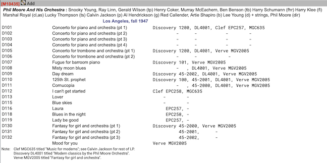 Discovery Records has been one of my main research areas for years. When I requested copies of AFM contracts for the label I was disappointed that Local 47 did not have any on file for 1947, the date that Jepson and Tom Lord attributed to the Phil Moore compositions and Calvin Jackson solo piano performances. As it turns out there were no contracts as Moore recorded these works independently in late 1947 and early 1948. https://jazzresearch.com/albert-marx-discovery-records-part-1/ Jim