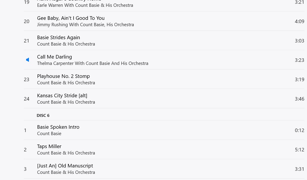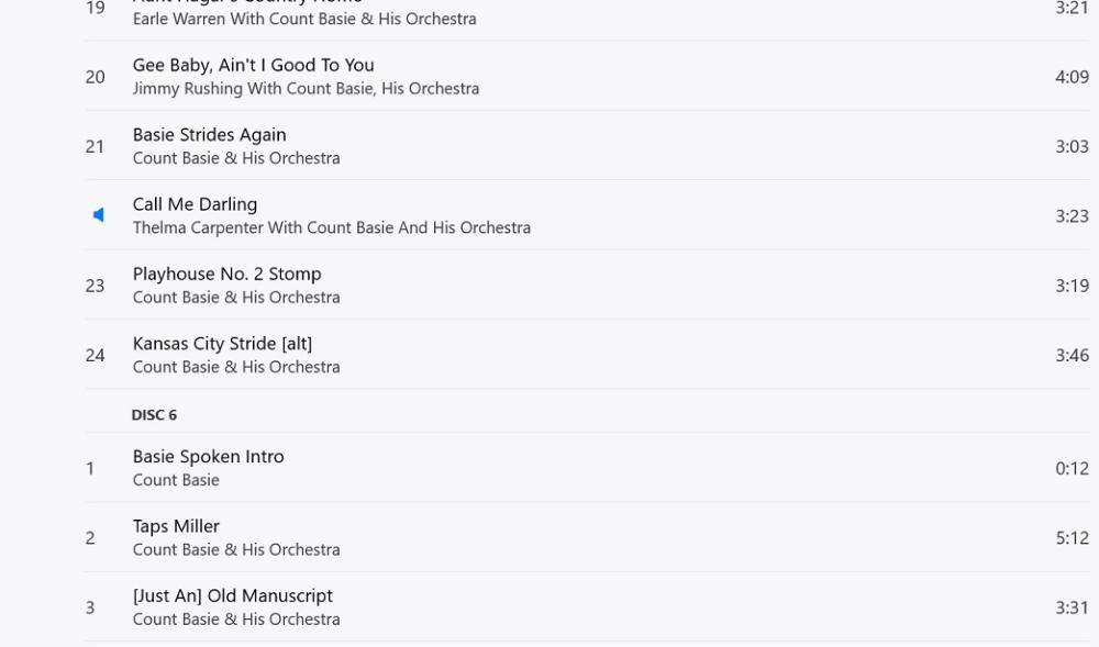 Disk 5 track 22 is Call me Darling with Thelma C. I think Fred has it right. Keep in mind that what you see on the player probably reflects the entry in Gracenote database which it picked up when you inserted the disk. I noted that there are multiple gracenote entries for some of the disks. I ended up changing the metadata for some disks because what came up had an 'album artist' of V-disk All Stars but other disks did not (I ended up deleting all those album artist entries in the song info). With collections that have multiple artists I always set it up to display the box with one head entry and then disk numbers show up in the track listing. Like this: -