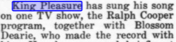 I've been on this King Pleasure obsession for the past year, largely because the mystery that surrounds him, anyways, I found this little mention of him on Downbeat for august 27, 1952 that mentions he was on a television program called the Ralph Cooper Program with Blossom Dearie. I would love to see it, but I doubt its possible. Also, I've always wanted to see photos of him performing on stage, there is one of him on his stage throne from 1954 and one from a 1972 reissue King Pleasure - The Source, but the image was altered. It would be nice to see the original. Thanks, if you can find it.